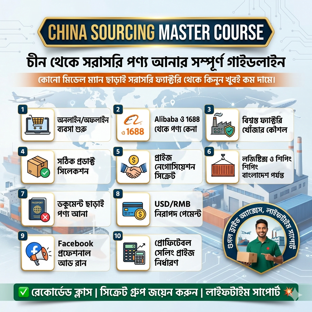 "আমি আগে Alibaba আর 1688 নিয়ে অনেক কনফিউজড ছিলাম। এই কোর্সটা করার পর এখন সরাসরি ফ্যাক্টরি থেকে প্রোডাক্ট সোর্স করতে পারছি। মিডেলম্যান ছাড়া কাজ করতে পারায় প্রফিট অনেক বেড়ে গেছে। সত্যিই ভ্যালু ফর মানি!"